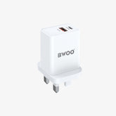 A 3-pin plug that is supported with 2 USB ports for dual-charging. The product also includes a USB-C charging cable.