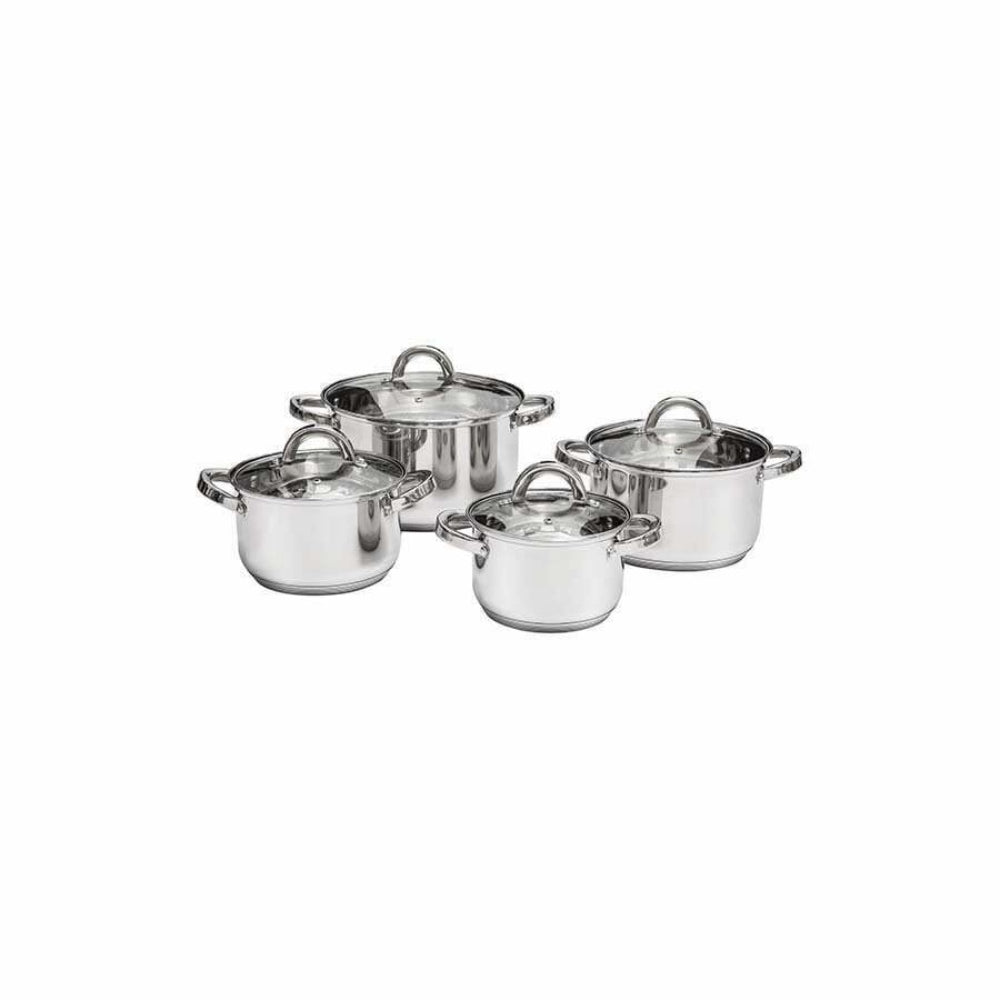 8-element berry pots by Ambition. Pots with tempered glass lids and metal handles. They are made of high quality stainless steel. Pots in a modern and elegant shape with a mirror finish inside and outside. There is a scale on the inside walls to facilitate measuring liquids. The pots have a thick bottom (0,5mm aluminium + 1,5mm iron + 0,5mm aluminium) ensuring quick and even heating of the dish and thick, rounded walls, belly type (0,5mm). Handles attached to the pot with rivets. The berry pot set is easy to keep clean, dishwasher safe, suitable for all types of cookers, including induction. Type of packaging: manufacturer's coloured box. The set includes: 1 pot 16cm with lid 1 pot 18cm with lid 1 pot 20cm with lid 1 pot 24cm with lid