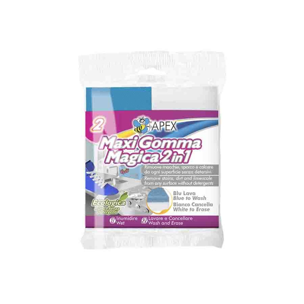 Special sponge that removes stains and limescale from all surfaces, without detergents or soap. Thanks to its special shape, the product guarantees a double action, blue silk for washing, white silk erasable