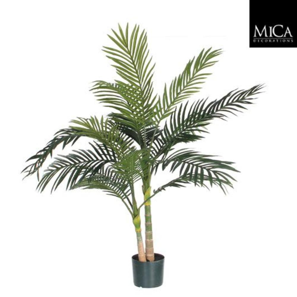 Whereas a real areca palm or gold palm screams for attention, this plant requires no maintenance whatsoever. That is the only difference, because this artificial plant from the Mica Decorations collection cannot be distinguished from the real thing. From the characteristic palm leaves to the colour gradient in the two trunks, everything has been reproduced in detail. The plant is firmly anchored in a black plastic pot, but has to be shaped before use. The rule of thumb here is that the leaf should look at you. After unfolding, place it as it is, or use the plastic pot as a solid base for an ornamental overpot. Combine it with other artificial plants and flowers from the collection and bring more green into your home. After shaping, the artificial plant is 120 cm high with a diameter of 100 cm. The plant is only suitable for indoors.