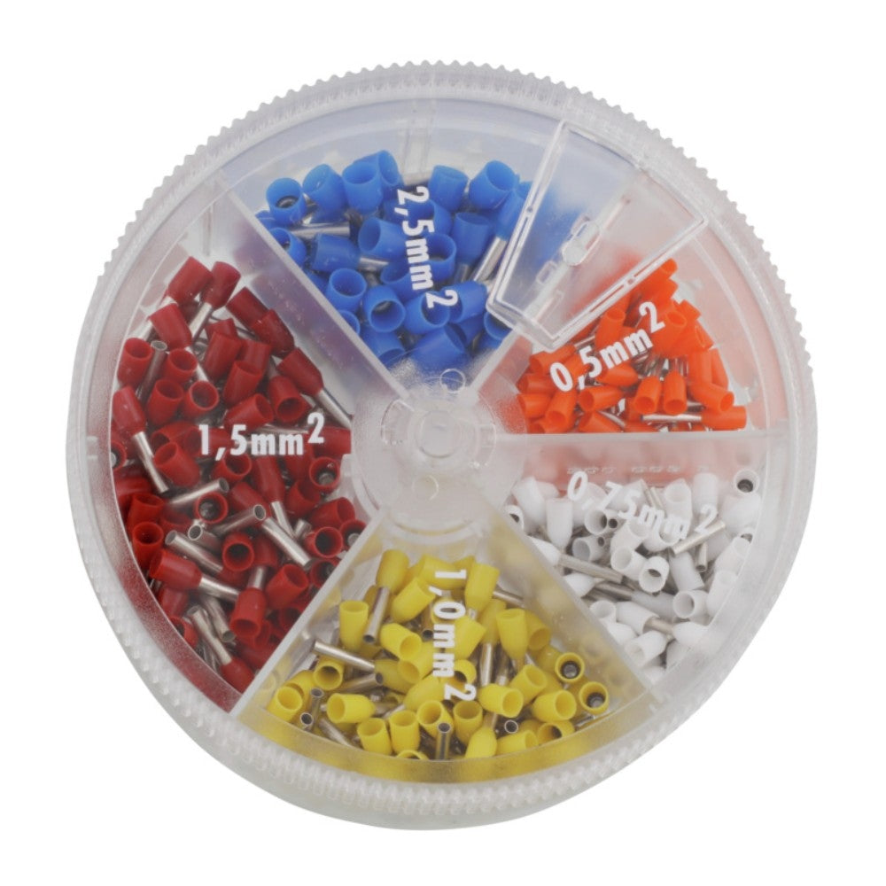 The sliding cover allows quick access and prevents contents from mixing.Equipped with insulated wire end ferrules (DIN 46228 Part 4).According to colour series II (ZF).Material of the box: Polypropylene (PP)Content remark: 50 x orange 0.5 mm²100 x white 0.75 mm²100 x yellow 1.0 m²100 x red 1.5 mm² 50 x blue 2.5 mm²