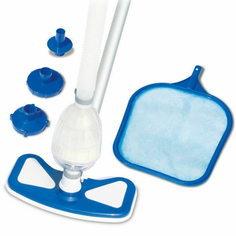 1 aluminum pole, 1 mesh netting, 1 skimmer, 1 piece 7.5-metre hose, the minimum flow of pump adaptor is 2,006 l/h, compatible with all pools