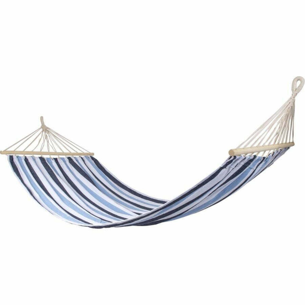 A cheerful and sturdy hammock. Relax on vacation, in the garden or on the balcony. Made of sturdy 320gr/m² cotton/polyester. The hammock has a spreading stick of 100 cm at the ends so the fabric stays fully open.