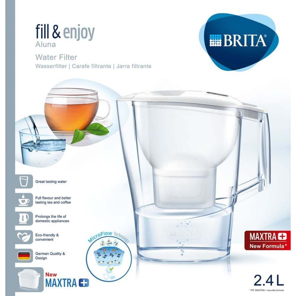 Slim, fridge door fitting design with 1,4 l filtered water capacity, 2,4 l total capacity and dishwasher safe (except lid). Includes formula maxtra+ filter cartridge with 25% finer mesh for better reduction of coarse particles, lasts 1 month Micro carbon pearls reduce chlorine and organic impurities which affect taste and odour of food and drink. Ion exchange pearls reduce limescale and metals protecting kettles and enhancing flavour and aroma of tea and coffee. Electronic memo reminder notifies you when to replace filter cartridge Tea-tastic Want the perfect cuppa? Make sure you've got the right ingredients - including filtered water to provide greater-tasting brews! New formula maxtra+ Including micro carbon pearls to lock away taste and odour impairing substances and ion-exchange pearls to protect against limescale build-up. Box contains 1 X brita aluna cool white 2,4l 1 X brita maxtra+ water filter cartridge