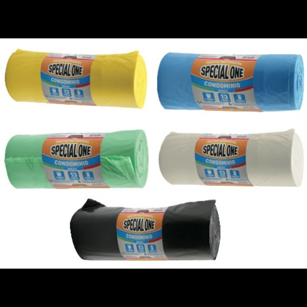 In polyethylene for separate waste collection 110 Lt., 70x110 cm., extra heavy, MY 60 micron thickness. Packs of 13 pieces = 1 kg. Green