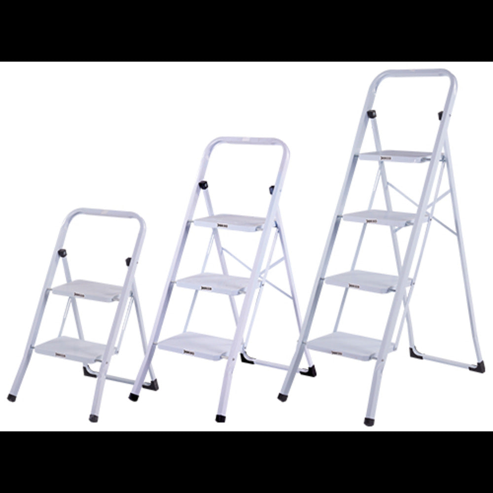 The space-saving stool measures just 3 cm when closed. thick, wide step for greater safety, in white painted steel. GS TUV certification 4 steps Dimensions L45xD85x125 cm.