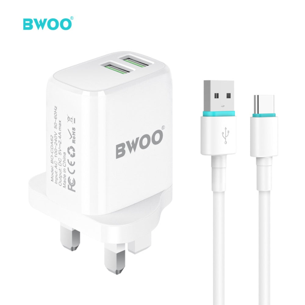 A 3-pin plug that is supported with 2 USB ports for dual-charging. The product also includes a USB-C charging cable.