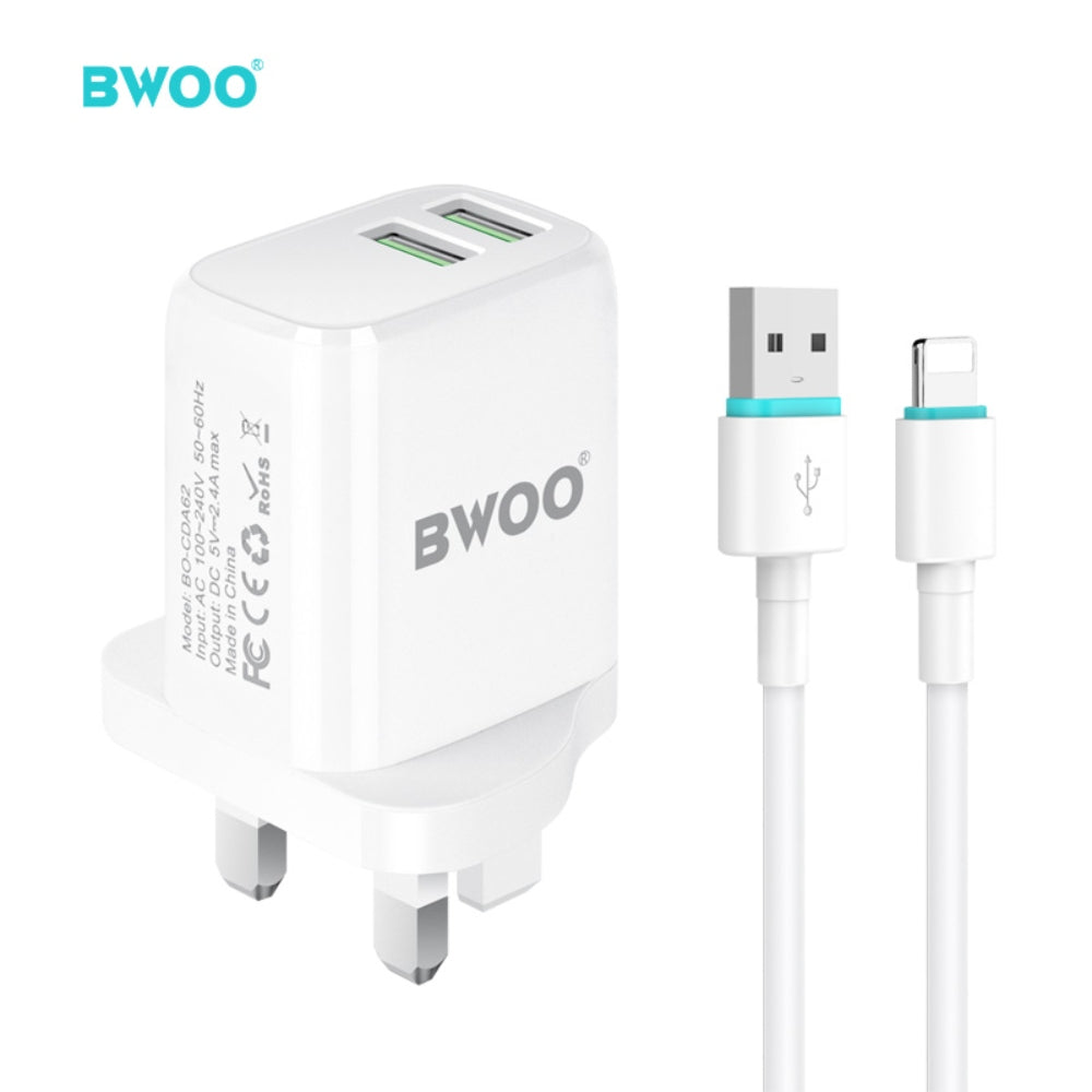 A 3-pin plug that is supported with 2 USB ports for dual-charging. The product also includes a USB-L charging cable.