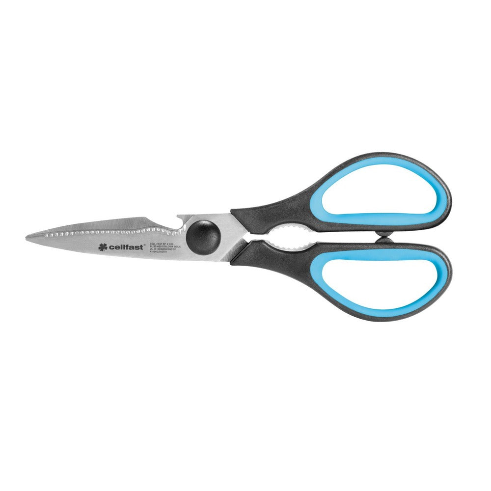 Multi-purpose scissors ENERGO™ multi-purpose scissors can be used as a bottle opener or nutcracker hardened blade, made of stainless steel serrated blade makes cutting easier and more controlled ergonomic shape of the handles provides comfort and convenience during use the scissors equipped with a guard to protect the blades