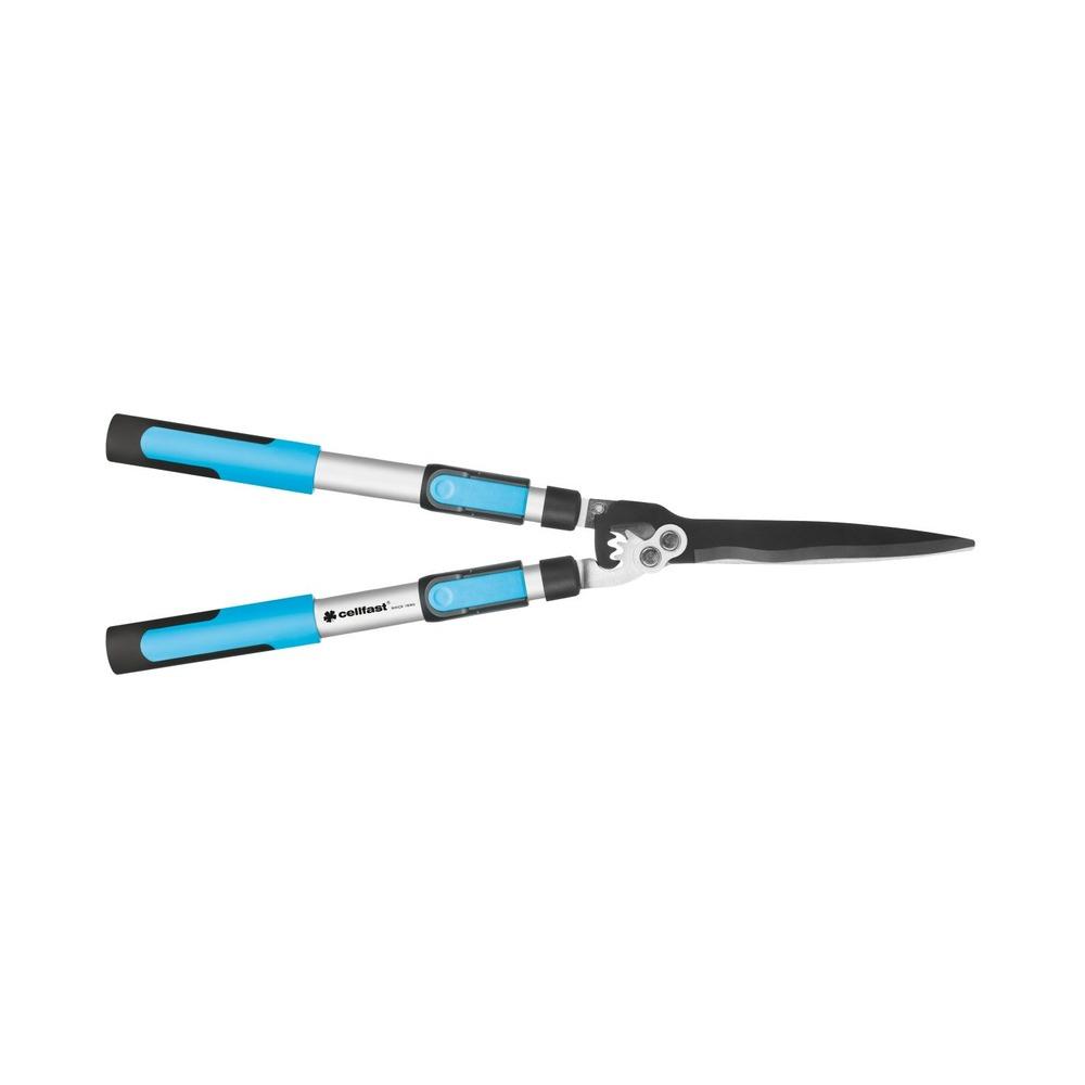 Telescopic garden shears IDEALâ„¢ two-handed grass shears designed for cutting bushes, small trees and hedges applied gear increases cutting force non-slip SAFETOUCHâ„¢ surface provides secure grip and comfort of use light, durable handles made of aluminium blade with length of 20 cm covered with non-stick surface telescopic option allows for easy and quick extension of the handle by additional 18 cm