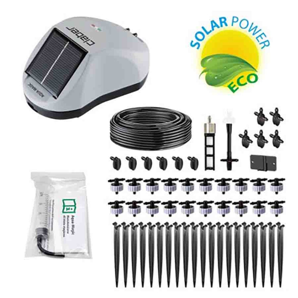 Want to set up a drip irrigation system without a tap or a power socket? Now you can with Aqua-Magic System an exclusive timer that exploits sunlight energy through its built-in photovoltaic panel and features an integrated pump to draw water from any provided tank. Up to 54 different irrigation programmes can be set using two simple dials to meet all your irrigation requirements. Aqua-Magic System is a complete kit which includes all the components (feeding tube drippers couplings and stakes) to set up a drip irrigation line easily and without the need for any special tool for delivering always just the right amount of water to up to 20 pots.