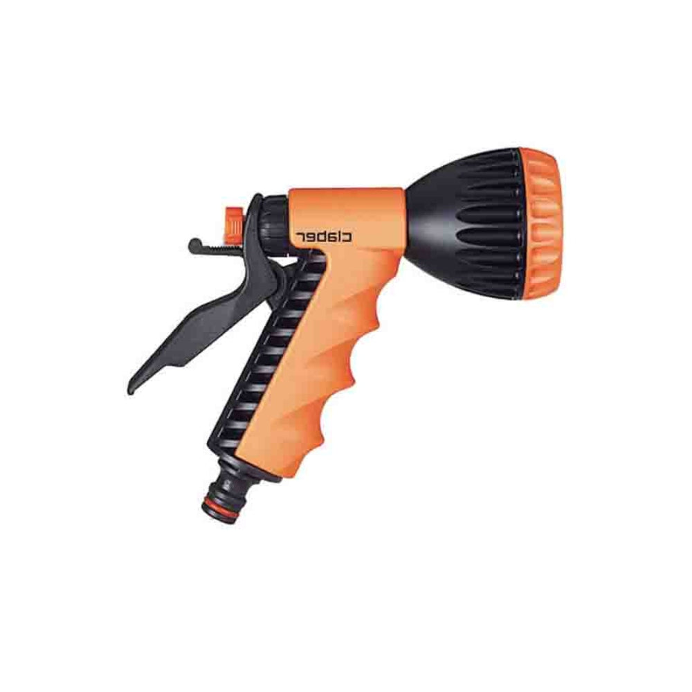 Spray pistol with practical ergonomic grip. Shower jet open and fine spray. Water flow adjustment lever. Jet lock device, stainless steel perforated disk.