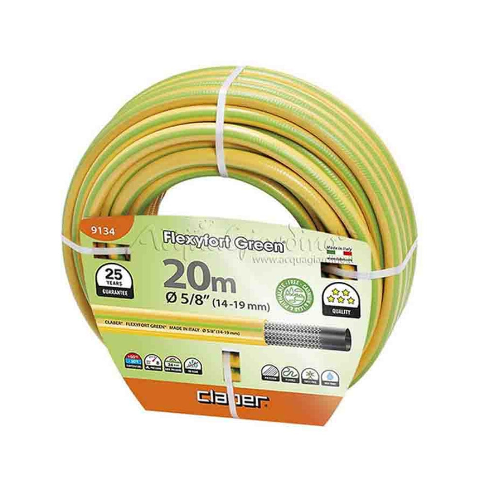 Claber flexyfort green 5/8 inch x 20mtr hose Braided hose with special anti-kink knotting: it does not twist even at high pressure. Algae-resistant and uv-resistant. The flexyfort green hoses are 100% safe, as they contain no heavy metals or phthalates. Diameter 5/8 inches length 20m Max pressure (bar) 8 Duration (years) 25 Non-crease