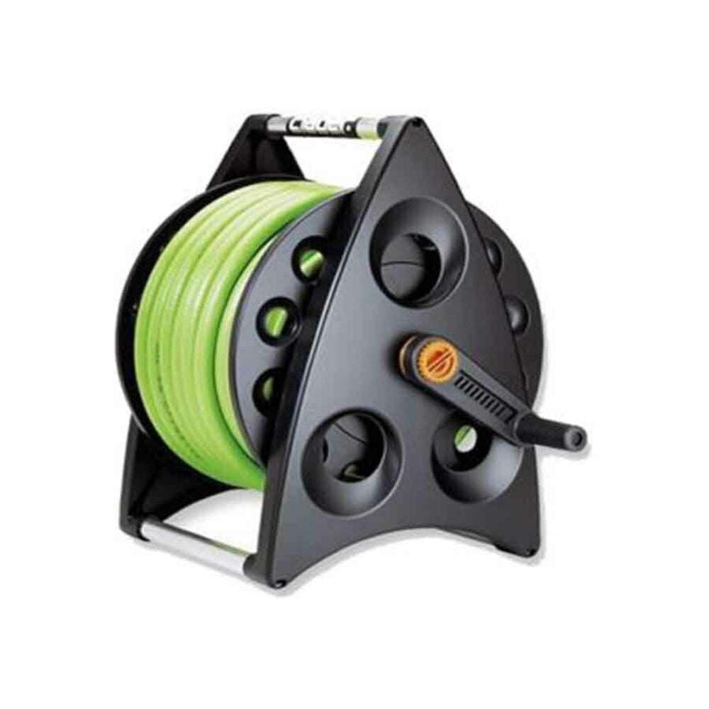 Modern design and state-of-the-art practicality for this compact hose reel which can be hung from the wall with the specific brackets or transported wherever you wish resting it stably on the ground. Offered in a small easy to transport case it assembles quickly without tools and is complete with 20 metres of hose jet spray nozzle 3/4 inch tap connector with 1/2 inch reducer 4 automatic couplings one with Aquastop which allows you to connect and disconnect the spray nozzle without having to shut off the tap.