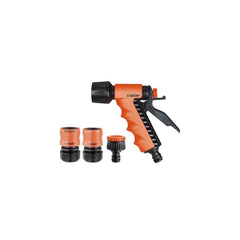 Everything you need to water efficiently and comfortably: all that's missing is the hose! Includes a spray pistol with ergonomic handle grip - compact sturdy easy and comfortable to handle - with a device to regulate and lock the water jet which is very useful in preventing hand fatigue a 3/4" tap connector with 1/2" reducer that is easy to install tool-free two automatic Quick-Click couplings one with the Aquastop device allowing you to connect and disconnect the pistol without having to shut off the tap.
