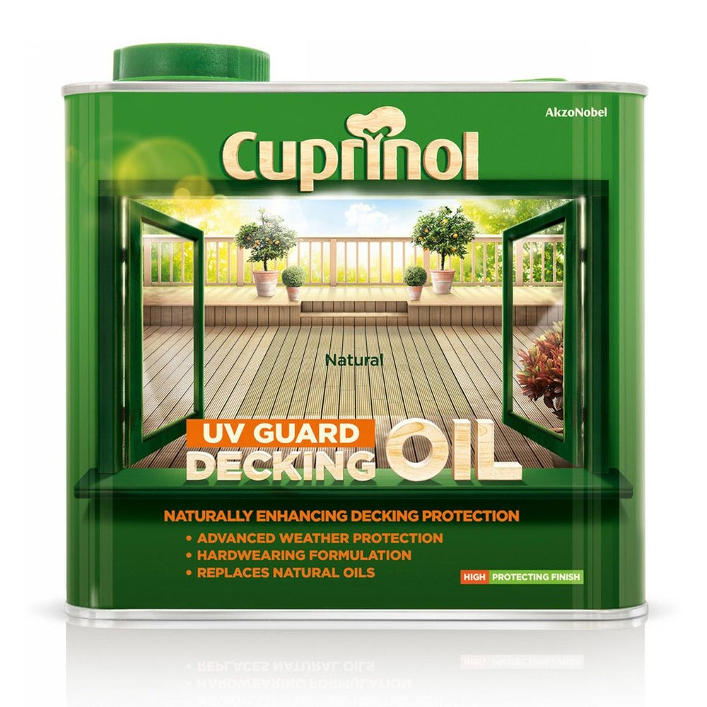 Cuprinol UV Guard Decking Oil can be brushed or spray applied to penetrate into the wood to replace natural oils and resins lost through weathering. Its tinted formula revitalises the colour of weathered wood. A 2.5 Litre Can covers up to 20m² with 2 coats brush applied or 1 coat spray applied. Coverage can vary depending on application method and the condition and nature of the surface. Drying times is up to 6 hours but this can vary depending on the nature of the surface and the weather conditions. Colour: Natural. Size: 2.5 litre.