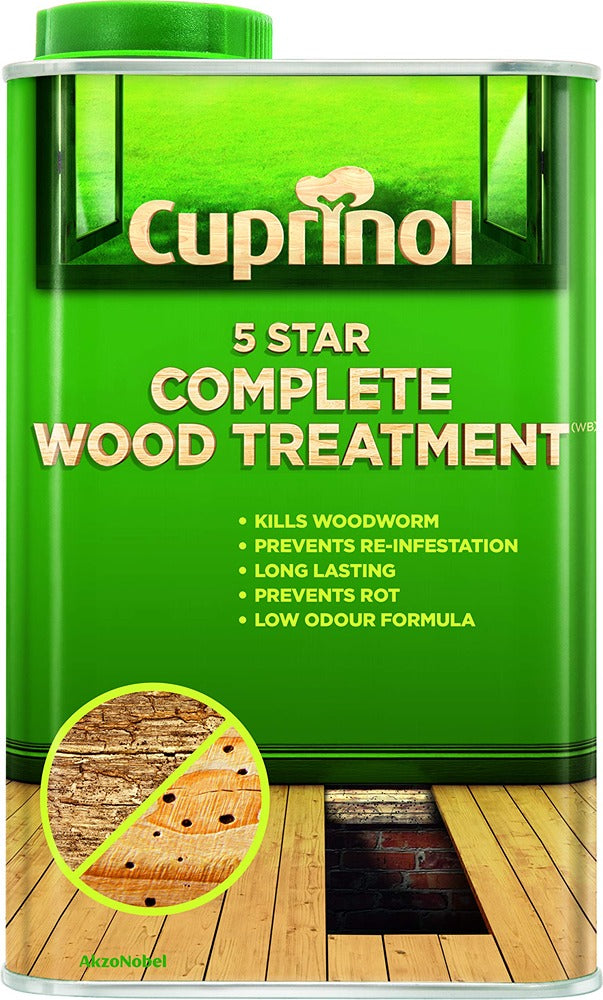 Cuprinol 5 Star Complete Wood Treatment (WB) is a clear, low odour, water based, all purpose treatment to prevent insect attack, re-infestation and protect from fungal decay. Features: Effective treatment and long lasting protection. Prevents re-infestation and fungal decay. Coverage: 2-12m/L. Drying time: 1 Hour. 2 Coats