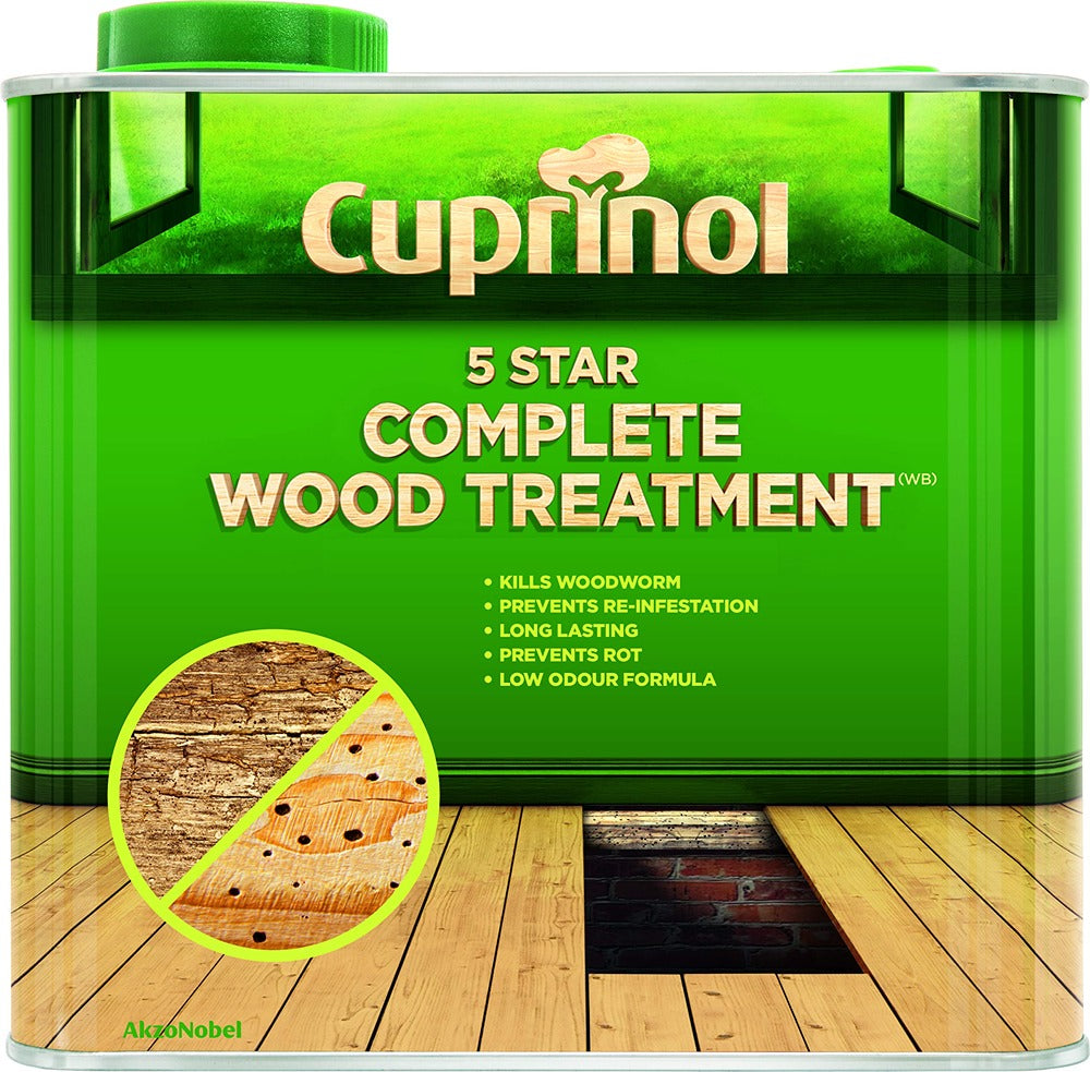 Cuprinol 5 Star Complete Wood Treatment (WB) is a clear, low odour, water based, all purpose treatment to prevent insect attack, re-infestation and protect from fungal decay. Features: Effective treatment and long lasting protection. Prevents re-infestation and fungal decay. Coverage: 2-12m/L. Drying time: 1 Hour. 2 Coats