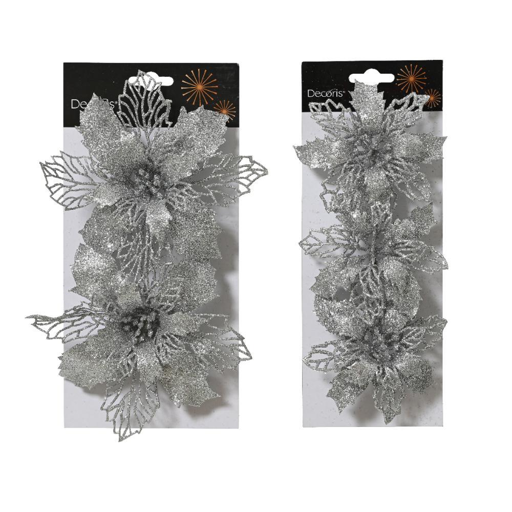 Decoris Poinsettia Silver Add a touch of elegance to your Christmas decor with the Decoris Poinsettia in shimmering silver. This festive floral piece is perfect for creating a cheerful holiday atmosphere. It's designed to effortlessly clip onto your Christmas tree, wreaths, or garlands, thanks to its convenient 2.3 cm clip. Key Features: - Striking silver colour to catch the eye - Made from sturdy plastic material - Length: 2 cm, Width: 13 cm, Height: 13 cm for versatile placement - Features three beautiful poinsettia flowers - Suitable for indoor use to brighten any space - Handy on-clip presentation, making it easy to attach and secure Transform your home into a winter wonderland with this stylish poinsettia decoration. It's the perfect piece to enhance your holiday festivities, filling your home with joy and sparkle. Make your Christmas setup truly magical with the Decoris Silver Poinsettia!