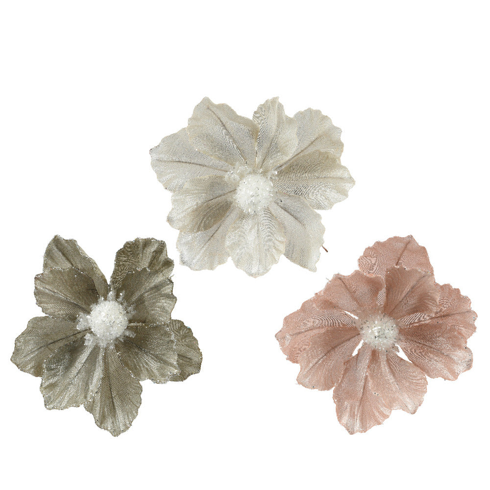 The Decoris Clip-On Polyester Flower with Glitter is a decorative accessory that can add a touch of elegance to your home decor or special events. Here are some details about this product: - Size: Each flower measures approximately 11cm. - Material: Made from polyester, which gives it durability and a realistic look. The glitter adds a sparkling effect, making the flower eye-catching. - Colors: Available in three assorted colors, allowing for versatile decorating options to match various themes or color schemes. - Clip-On Feature: The clip design makes it easy to attach the flower to a variety of surfaces, such as wreaths, garlands, arrangements, or even clothing and accessories. These flowers can be used for various occasions, including weddings, parties, or seasonal decorations. They offer an easy way to enhance your decor without the need for extensive arrangements.