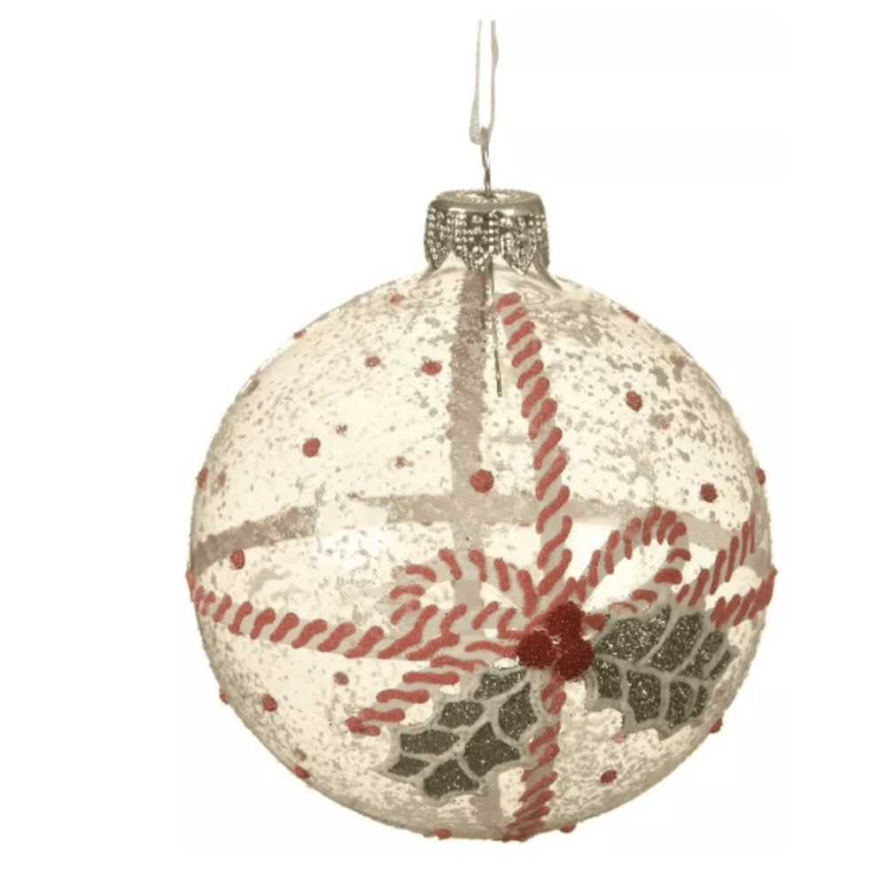 This beautiful 8cm glass bauble is frosted for a elegant touch, with a gift bow and mistletoe design. The transparent glass allows for the light to shine through, creating a lovely festive atmosphere in your home. Hang it on your tree or use it as a unique decoration around the house. It would also make a wonderful gift for a loved one this holiday season. Add a touch of magic to your Christmas decor with this Decoris glass bauble.