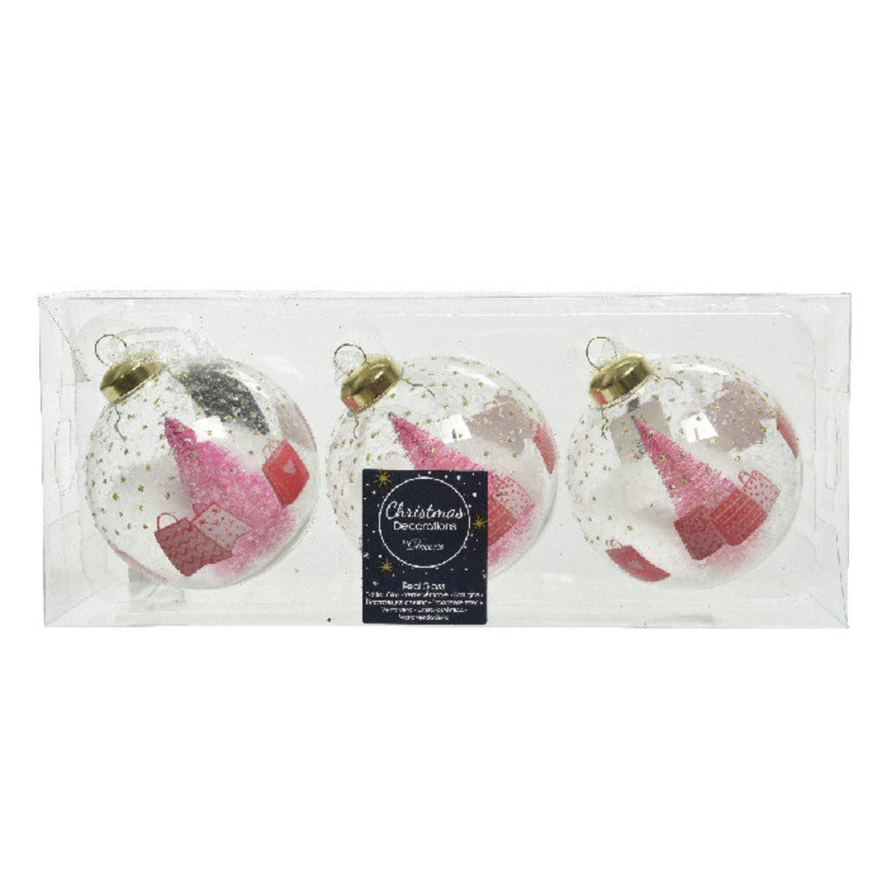 Enhance the beauty of your Christmas tree with this stunning Decoris Glass Bauble Set. This set includes 3 pieces of 8cm baubles, each featuring a delicate pink tree design on a transparent glass surface. The intricate detailing and vibrant colour of the pink trees will surely add a touch of elegance and charm to your holiday decorations. Made of high-quality glass, these baubles are durable and will bring a festive atmosphere to your home year after year. Add a touch of sophistication to your Christmas tree with this beautiful set of glass baubles.