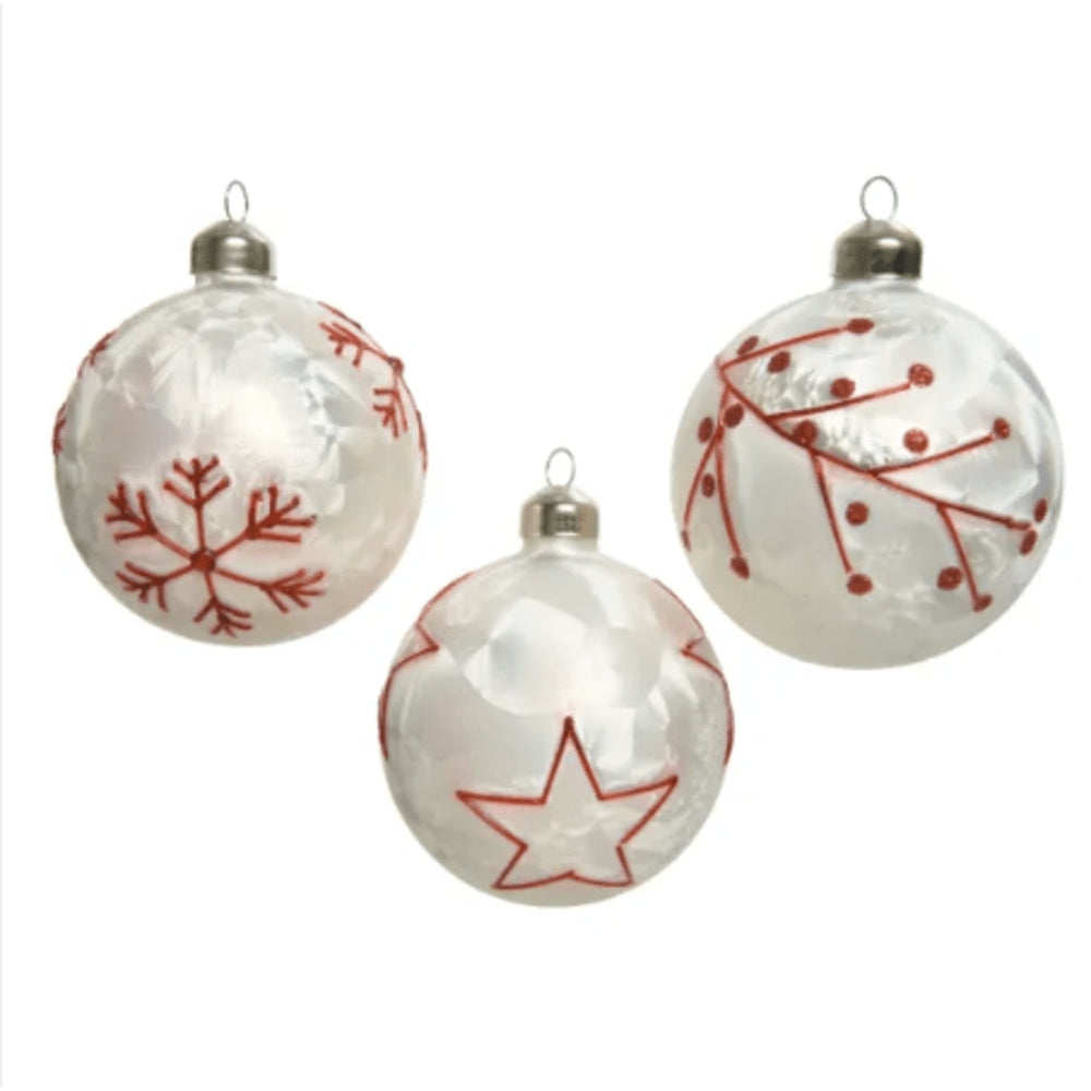 Add a touch of festive charm to your Christmas tree with these beautiful Decoris glass baubles. Each bauble features an ice lacquer finish for a shimmering effect, and a red design for a pop of colour. Measuring 8cm in diameter, these baubles come in 3 assorted designs for a varied and unique look on your tree. Sure to bring a touch of elegance and sophistication to your holiday decor, these baubles are a must-have for any Christmas enthusiast.