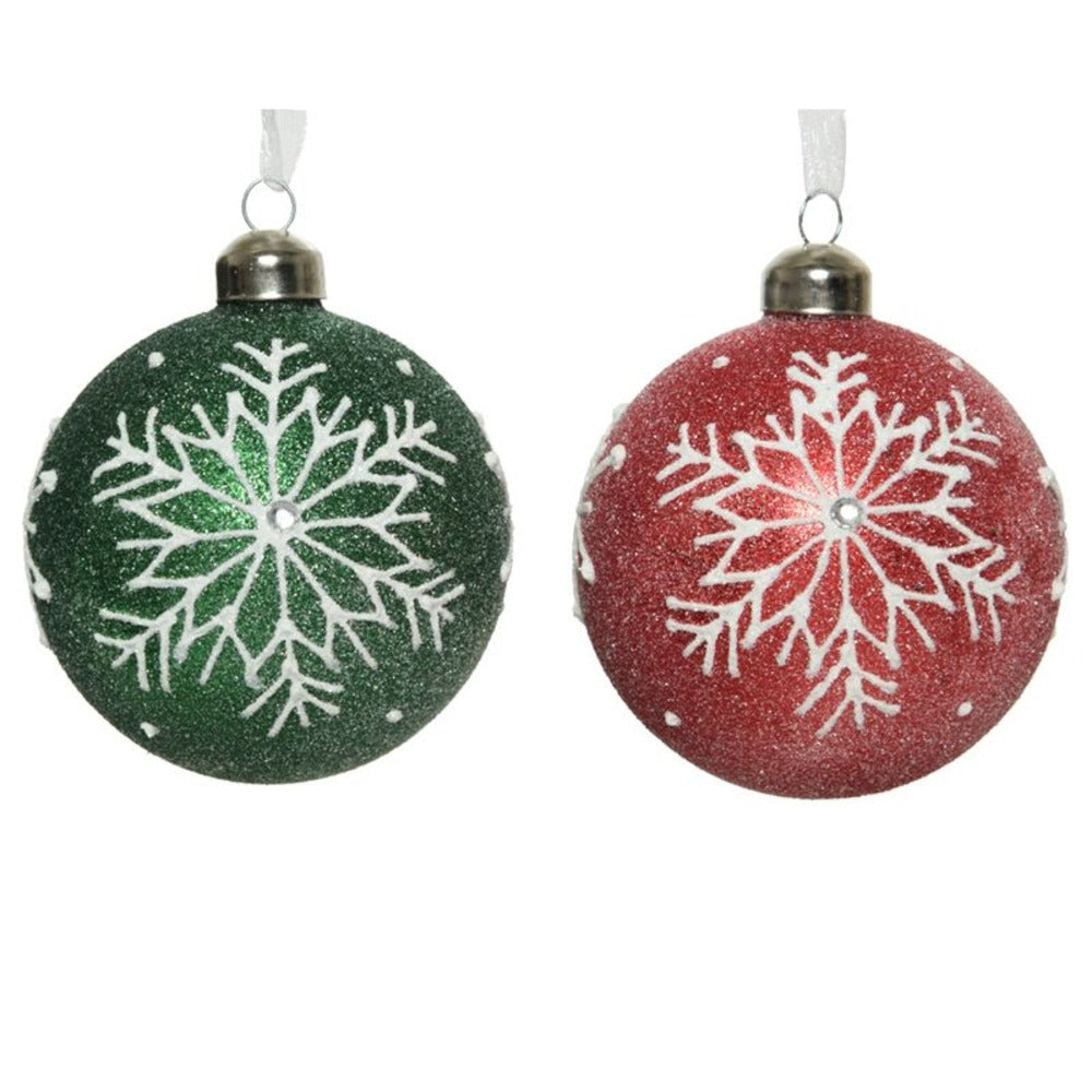 Add a touch of winter wonderland charm to your Christmas tree with these Decoris Glass Baubles. Each bauble features a delicate snowflake design with white glitter accents for a sparkling touch. The baubles come in two assorted colours - choose from red or green to suit your festive decor. Measuring 8cm in diameter, these baubles are the perfect size for adding a touch of elegance to your holiday decorating. Mix and match colours for a coordinated look, or display them together for a coordinated look. These baubles are sure to add a touch of glamour to your Christmas tree this season.