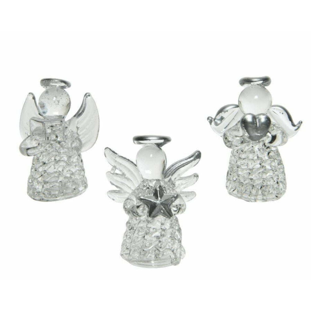 Glass angels to hang from the Christmas tree. Angels holding either a heart - star - book. They would make a pretty addition to any Christmas tree this year. Measure approx. L4.00-W4.00-H4.50cm Colour: Clear. Mouthblown: Yes. Decoration: Spun glass.