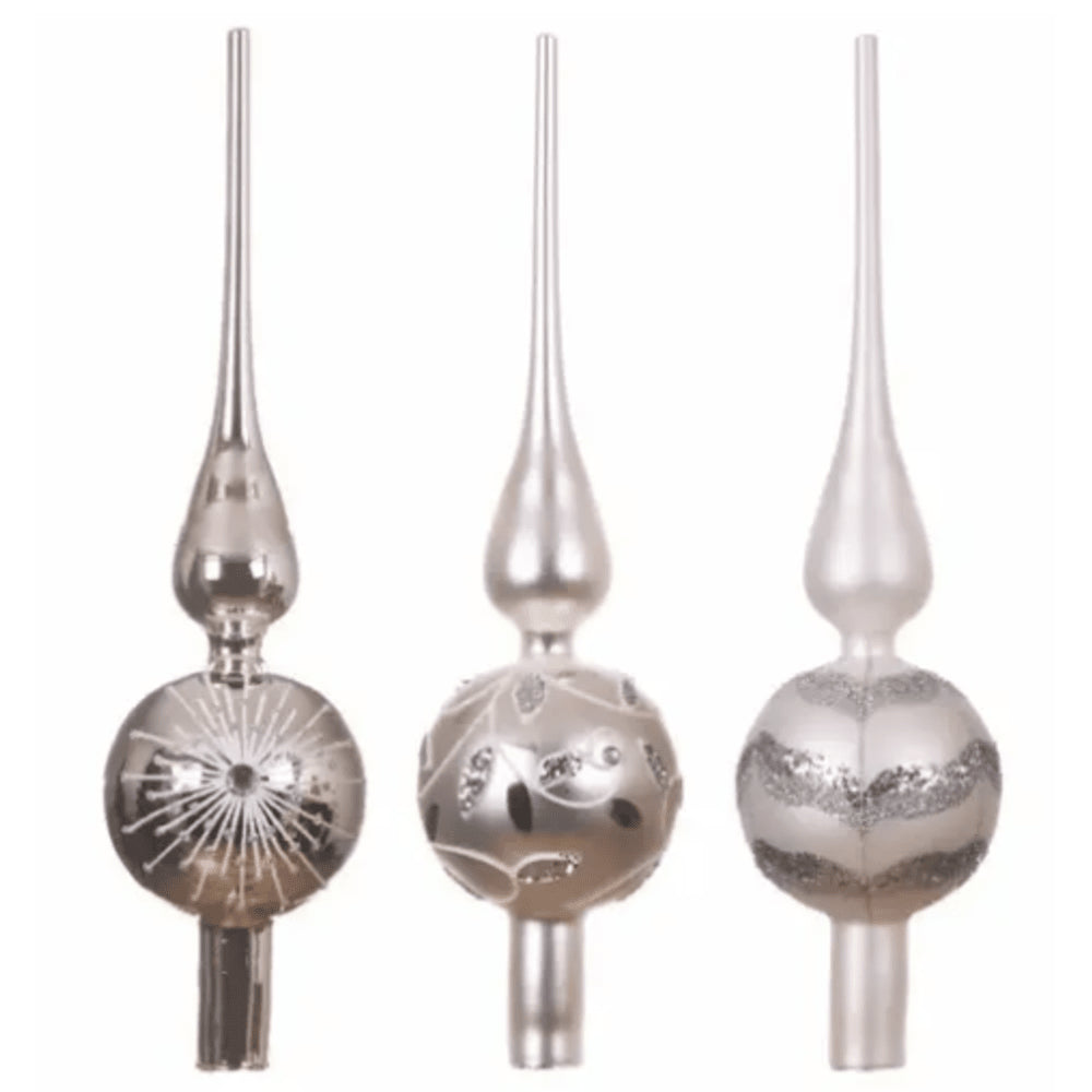The 31 cm high, 8 cm diameter Christmas tree topper is an essential decoration for every Christmas tree. Made of glass, it presents three different versions, each of which exudes a festive glow and the characteristic atmosphere of Christmas decorations. The first variant is a silver tip with a shiny finish, decorated with silver glitter and a silver diamond embedded in it. These subtle, shiny elements give it elegance and extraordinary shine, perfectly reflecting the character of the holidays. The second tip looks matte, in silver tones, decorated with silver swirls, glitter leaves and silver diamonds. These delicate details give it a unique charm, combining classic with subtle shine. The third option is a silver tip with a matte finish, the main decorative element of which is a thick decoration made of silver glitter. Its intensity and expressiveness perfectly match traditional Christmas motifs.