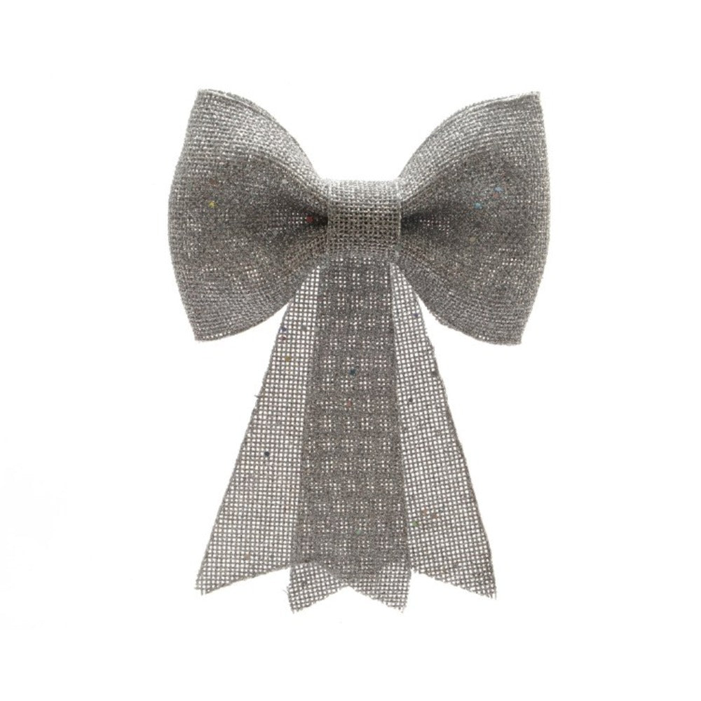 Decoris Bow Silver This eye-catching Decoris Bow is perfect for adding that finishing touch to your Christmas decorations. Designed to create a festive atmosphere effortlessly, it's a must-have for anyone looking to spruce up their holiday décor. - Elegant silver colour with a shimmering glitter finish - Crafted from durable plastic - Dimensions: Length 2.5 cm, Width 12 cm, Height 14 cm - Easy to hang using the fishing wire hanger The glittery silver finish brings a sparkle to your Christmas tree, wreaths, or mantelpiece, ensuring your home is filled with holiday cheer. Whether you're planning a splendid Christmas party or looking to brighten your living space with festive charm, this bow guarantees a stylish addition. It's simple to install and pairs beautifully with both traditional and modern décor themes. Get ready to celebrate the most wonderful time of the year with this delightful Decoris Bow!