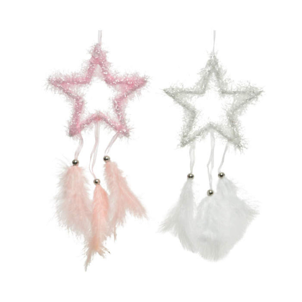 Add a touch of elegance and whimsy to your home decor with this Decoris Hanging Star with Feathers. This beautiful hanging star comes in two assorted colours, making it easy to match any interior style. Measuring 27cm in size, this decorative piece is sure to make a statement in any room. The delicate feathers add a unique and stylish touch to this star, making it the perfect addition to your living space. Add it to a gallery wall, hang it above a bed, or display it on a mantel for a touch of bohemian charm.