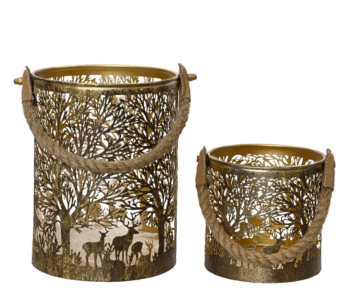 The Decoris Iron Round Lantern Set of 2 features a stylish design with cut-out scenery that adds a charming touch to any décor. Constructed from durable iron, these lanterns are both functional and decorative. They come with a sturdy rope handle, making them easy to carry or hang wherever you desire.