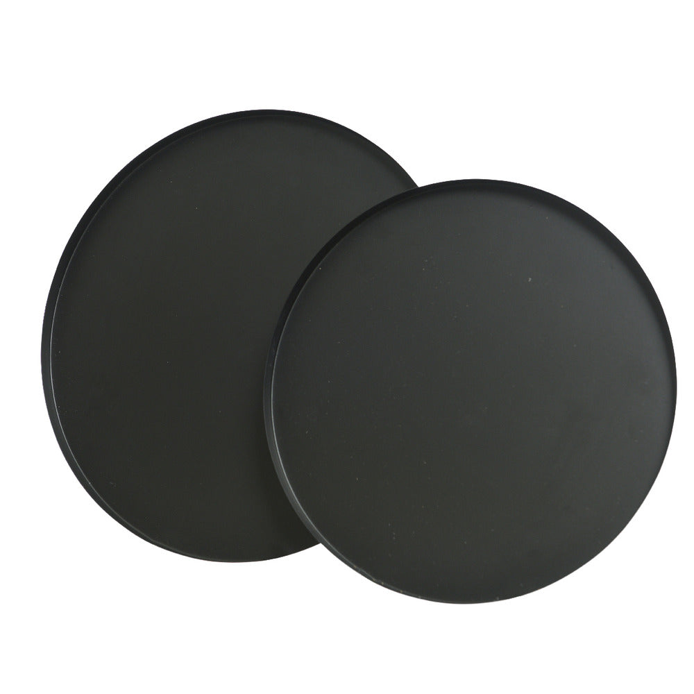 These beautiful decorative underplates are multifunctional. Made of metal, in a black color with a handy raised edge. Use the trays on a table or side table and place beautiful candlesticks, tea light holders or small vases with dried flowers on them. You can also use them as a tray or hardened top on a soft side table. The set consists of a top with a diameter of 30 cm and a top with a diameter of 35 cm. Brand: Decoris Set of 2 Colour black Shape: round Material: metal Dimensions: Ø30 / Ø35cm
