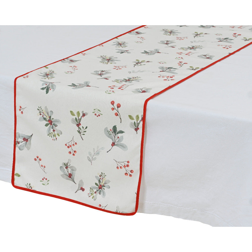 Cotton tablecloth, measuring at the size of 32cm by 150cm, featuring a delicate holly design with white background and red edging.