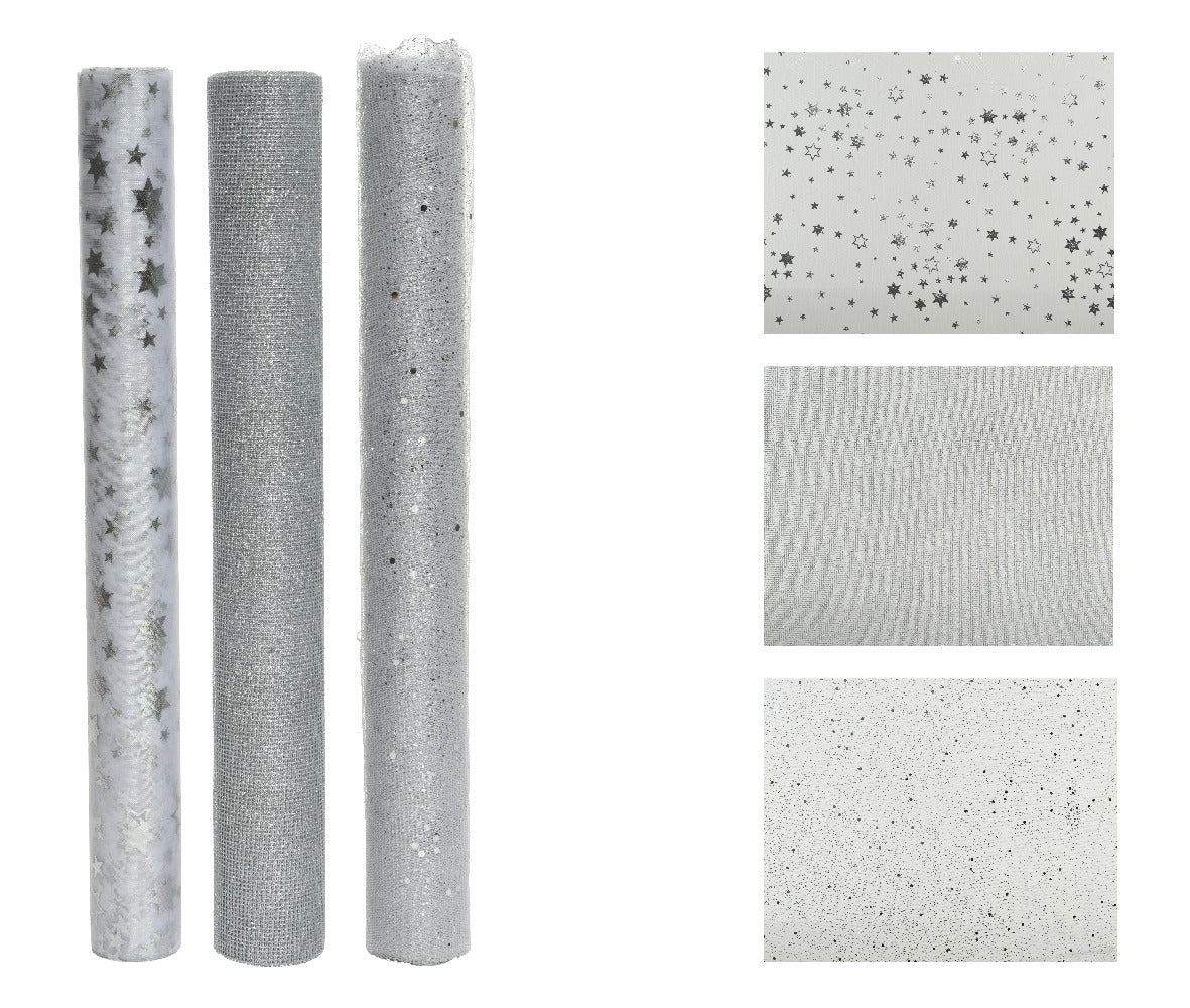 Decoris Deco Fabric Silver Elevate your festive table setting with this Decoris Deco Fabric in stunning silver. This product is perfect for adding a touch of elegance to your Christmas dining area or any other festive occasion. - Made from quality polyester, ensuring durability and a luxurious feel - Gorgeous silver colour to complement any decor - Dimensions of 200 cm in length and 35 cm in width, suitable for various table sizes - Features a sophisticated mesh and organza decoration for added texture - Finished with a dazzling glitter and foil effect that captures the light beautifully This deco fabric is ideal for indoor use, making it a great choice for table runners or other creative designs. Whether you're hosting a holiday dinner or celebrating a special event, this exquisite fabric will provide that extra sparkle to enhance your seasonal ambiance. Easy to integrate into your festive decor, it's time to transform your home into a winter wonderland.