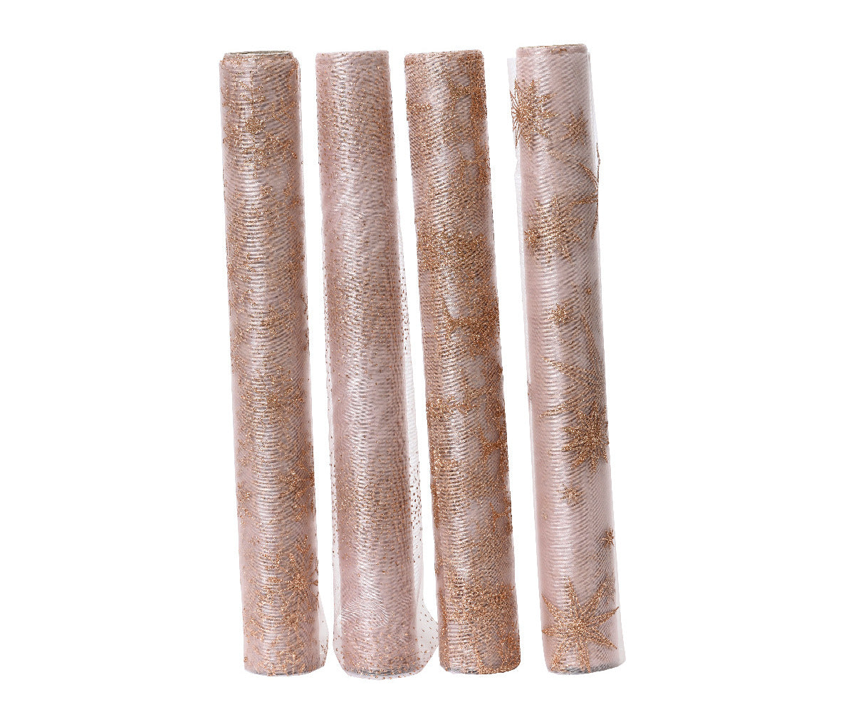 Polyester fabric mesh roll with gold glitter, measuring at the size of 35cm by 200cm, in the colour pink.