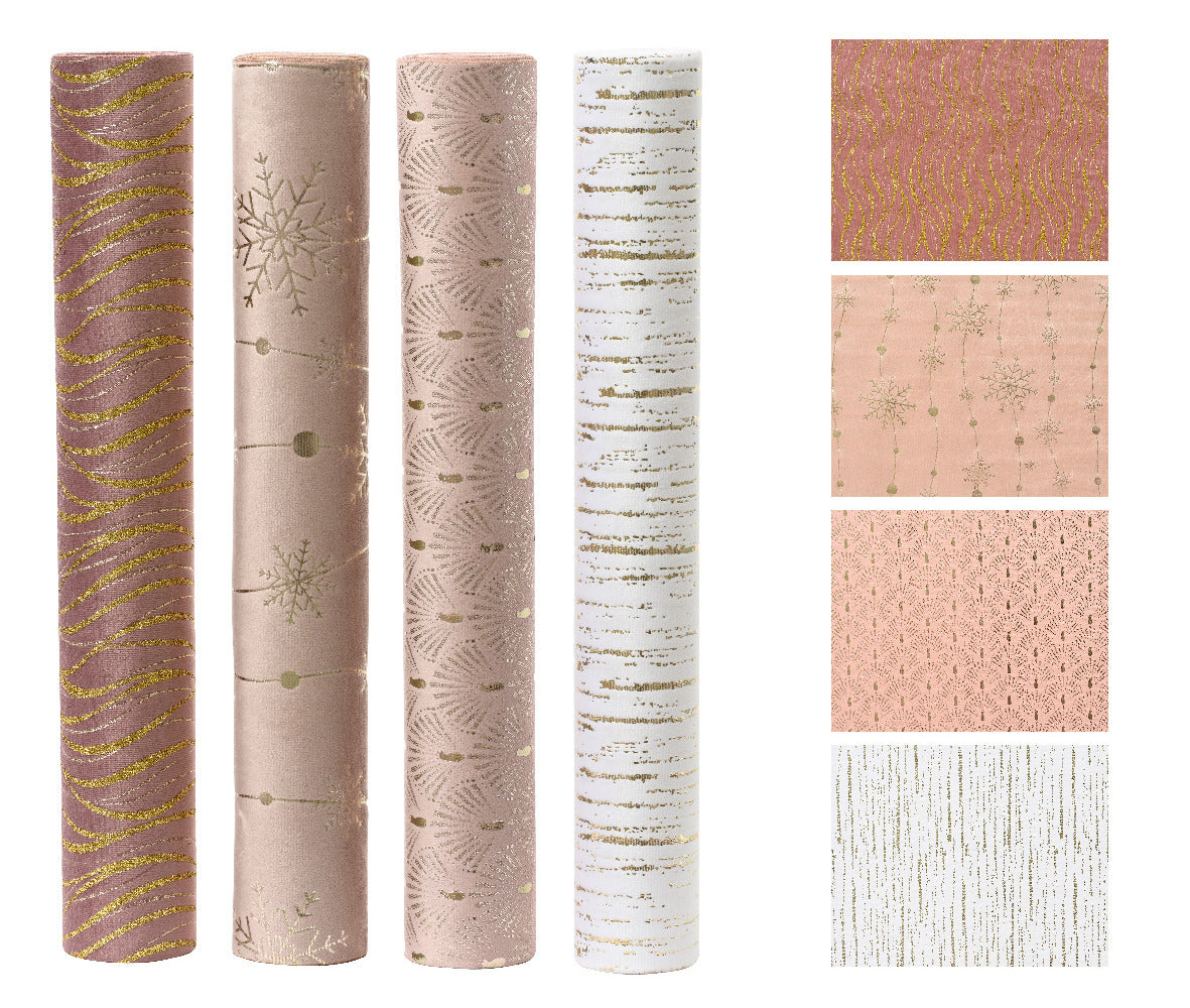 Polyester fabric roll with velvety finish and gold foil decoration, measuring at the size of 35cm by 200cm. Choose from 4 different designs in the shades of pink.