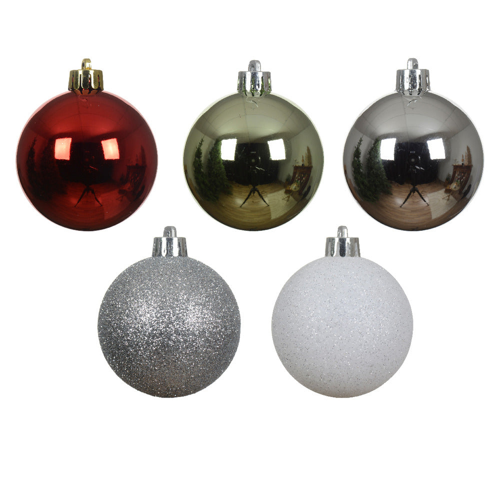 Brighten up your decorations with these 30 premium quality 60mm shatterproof baubles. This pack has 18 baubles with shiny finish and 12 baubles with glittery finish. They're shatterproof, so you won't have to worry about any accidental breakages. Key Features: Size - 60mm. Shatterproof. 6 x Glittery Silver, 6 x Shiny Silver. 6 x Glittery White, 6 x Shiny Red and 6 x Shiny Green.