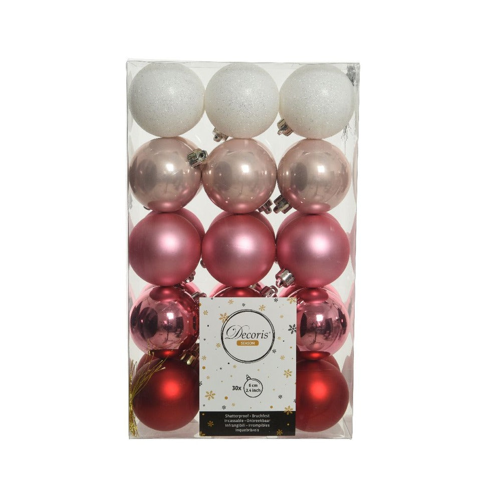 ?Brighten up your decorations with these 30 premium quality 60mm shatterproof baubles. This pack has 18 baubles with matte finish and 12 baubles with shiny finish. They're shatterproof, so you won't have to worry about any accidental breakages. Key Features: Size - 60mm. Shatterproof. 6 x Oxblood, 6 x Blush Pink Shiny. 6 x Oxblood, 6 x Pink and 6 x White matte.