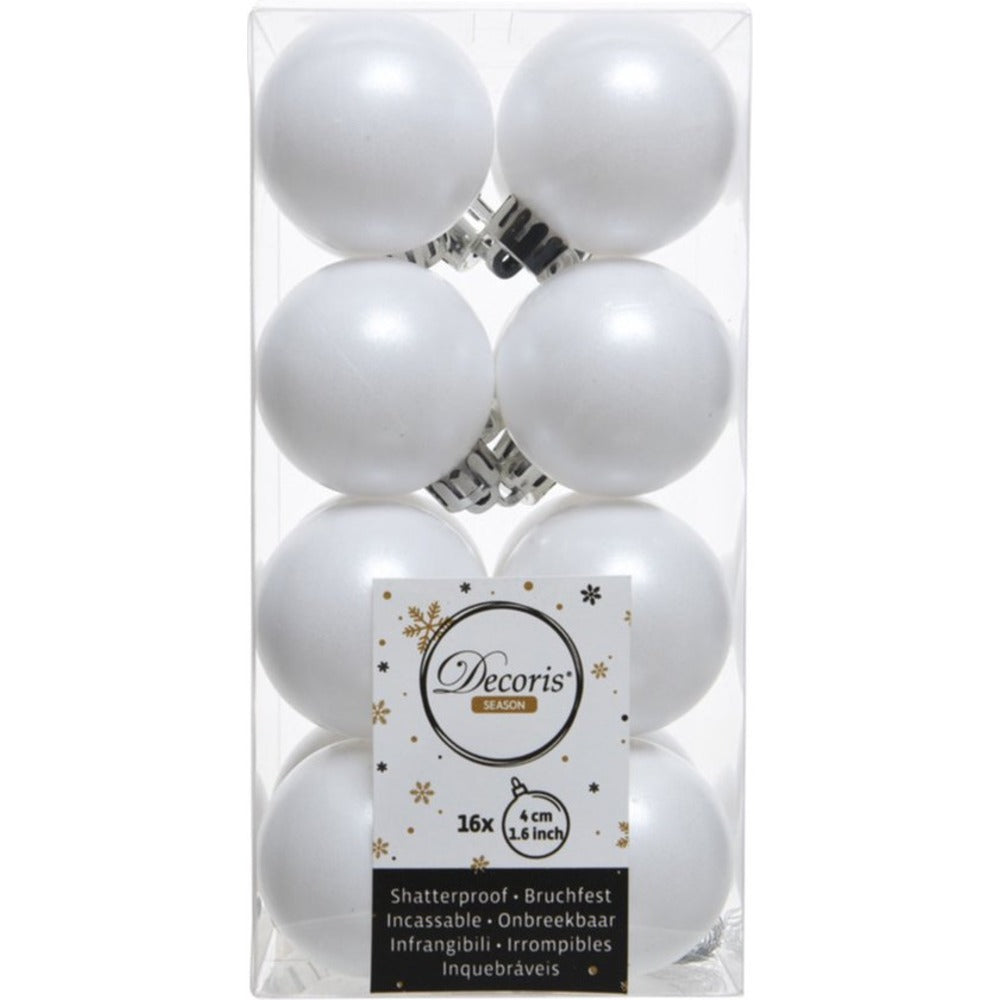 Decoris Shatterproof Christmas Bauble Winter White What is this product for? These baubles are perfect for adding a touch of elegance and safety to your Christmas tree without the worry of breakage. - colour: Winter white for a classic, frosty look - Diameter: 4 cm, ideal for subtle yet sophisticated decoration - Material: Made from recycled polystyrene, ensuring durability and a lightweight design - Finishing: Matte finish for that understated elegance - Shatterproof: Yes, designed to be resilient and kid-friendly - Cap colour: Silver, complementing the sleek, icy aesthetic - Way of hanging: Conveniently with a silver wire, making it easy to attach to your tree These shatterproof baubles offer a chic and timeless look, effortlessly enhancing your festive decor. The elegant winter white shade, coupled with a subtle matte finish, adds a beautiful contrast to the lively greens of your Christmas tree, inspiring festive cheer throughout your home. Decorate with confidence, knowing they’re both durable and stylish—perfect for families and pet owners alike. Make your holidays both safe and sophisticated.