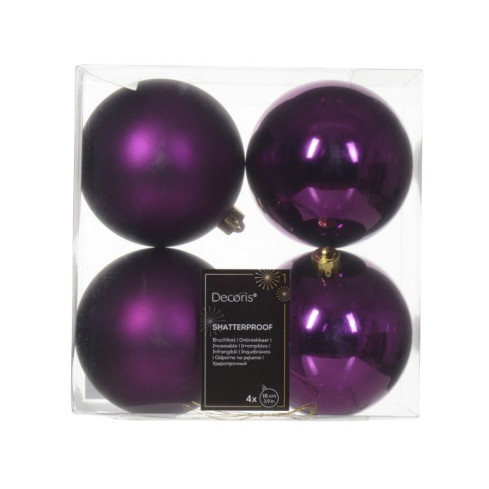 Christmas Decoration - Pack of 4 Shatterproof Baubles from Kaemingk. Great for decorating Christmas trees. Colour: 2 shiny violet, 2 matte violet. Specifications: Shatterproof. Cap colour: Gold. Way of hanging: Gold wire. Diameter: 10cm.