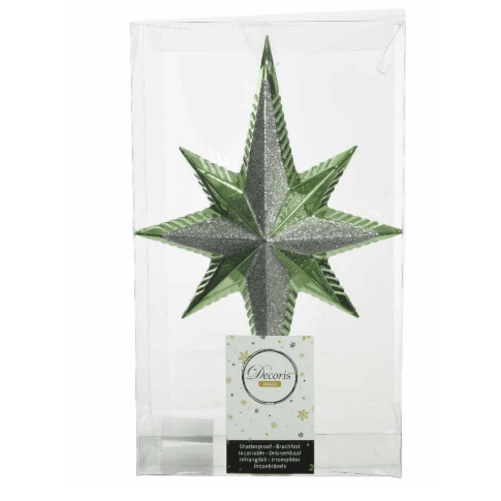 Add the perfect finishing touch to your Christmas tree with the Decoris Shatterproof Peak Star Tree Topper. This elegant mistletoe green star measures 25.5cm in height and is shatterproof, making it safe to use in homes with children or pets. The beautiful design of the star will add a touch of glamour to your festive decor. Make your tree shine bright this holiday season with this stunning tree topper.