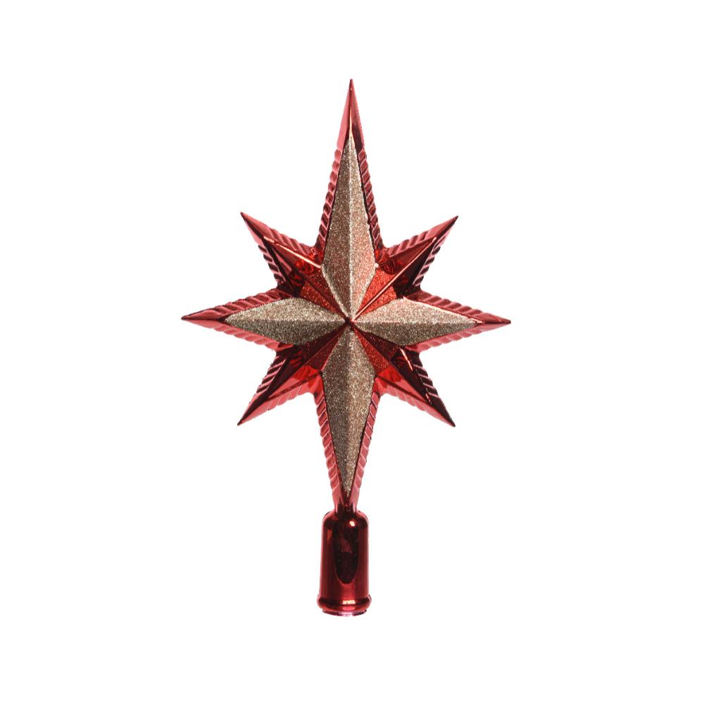 Decoris Shatterproof Treetopper Christmas Red Add the perfect finishing touch to your Christmas tree with this striking Decoris Shatterproof Treetopper in a festive Christmas red. Designed in a classic star shape, this topper will ensure your tree is the star of your holiday decor! It's crafted from durable polystyrene, making it not only beautiful but also shatterproof and easy to handle. - colour: Christmas Red - Height: 25.5 cm - Width: 14.5 cm - Length: 6.5 cm - Made from recycled polystyrene for a reliable structure - Shatterproof construction for a worry-free festive season - Glitter finish for an extra sparkle This treetopper is lightweight and easy to secure at the top of your tree, bringing an enchanting glow to your home. Its glittering red finish adds a festive sparkle, capturing the magic of the season. Make sure your tree is the highlight of your holiday celebrations with this superb Decoris Treetopper!