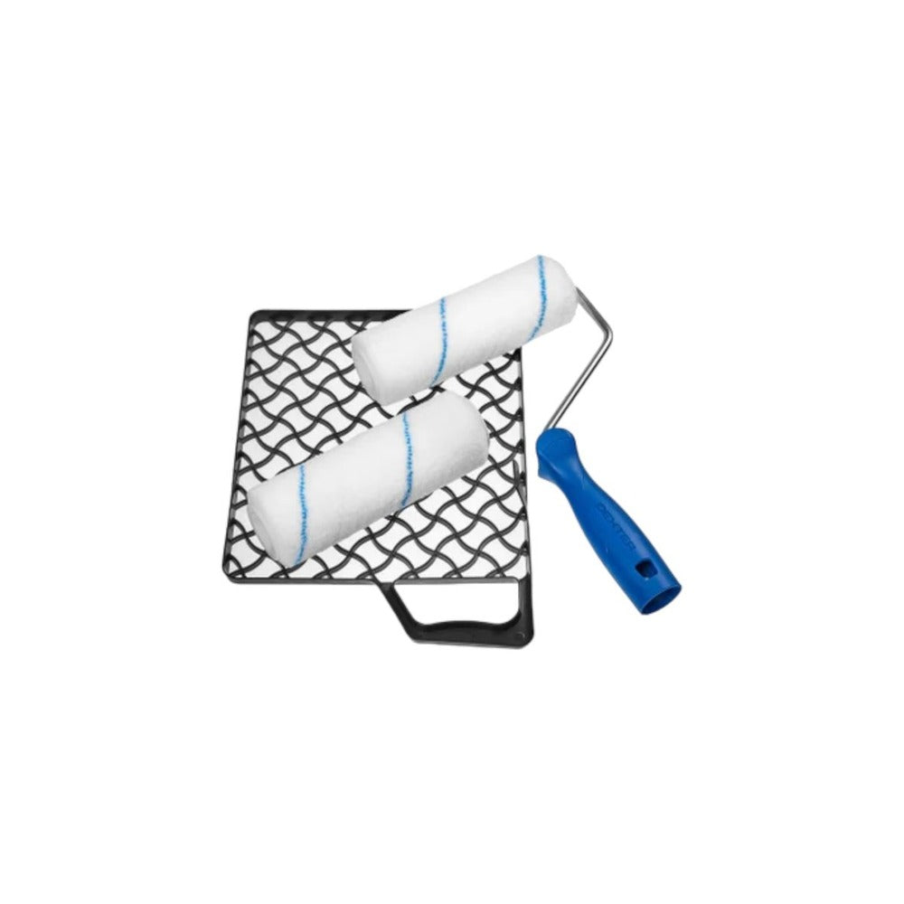 Universal kit to paint your walls and smooth ceilings, consisting of a universal roll 18 cm + 2 refills and a paint grid. Kit ideal for painting your walls and ceilings. Usable with all types of paint: acrylic or alkyd. The roller handle and is adaptable reusable with all refills 180mm. Fibers 10mm thick for a result smooth and an anti-drop application. To limit the environmental impact, grid and handle are plastic recycled from 100% of waste treated and re-used appliances.