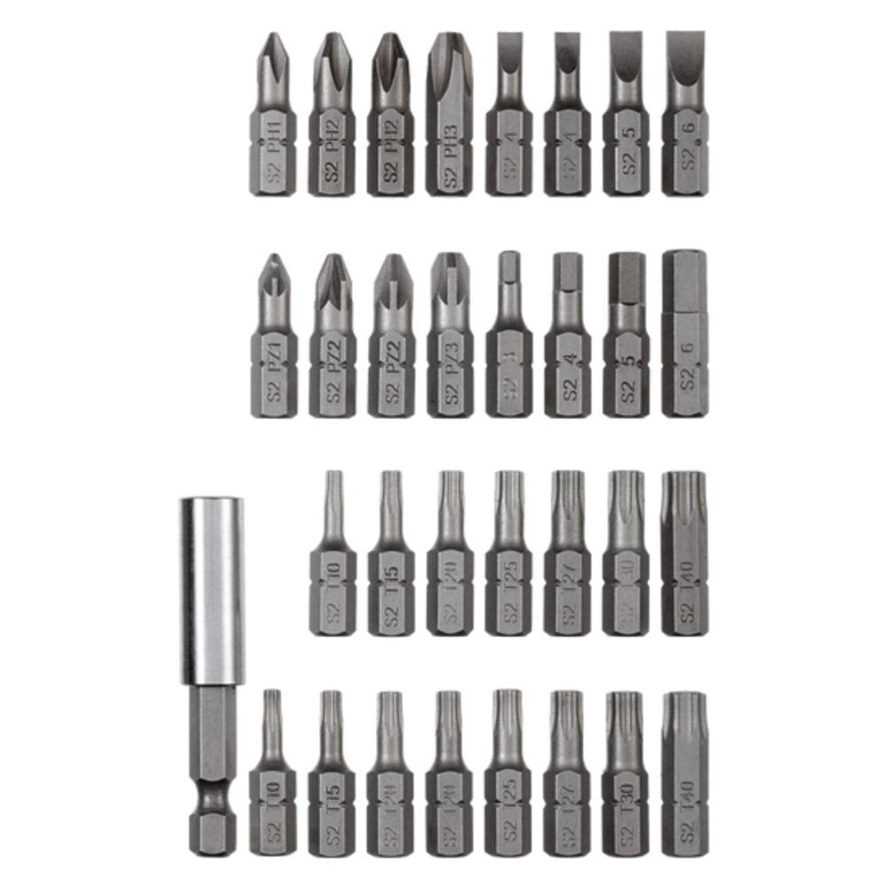 25Mm Bits Ph1, Ph2,Ph2, Ph3, Pz1, Pz2, Pz2, Pz3, Sl 3X0,5, Sl 4X0,5, Sl 5X0,6, Sl 6X1, H3, H4, H5,H6,T10, T15, T20,T20, T25, T27, T30,T40, Tt10,Tt15, Tt20, Tt25, Tt27, Tt30,Tt40,54Mm Magnetic Bit Holder,S2 Steeel,Stamped