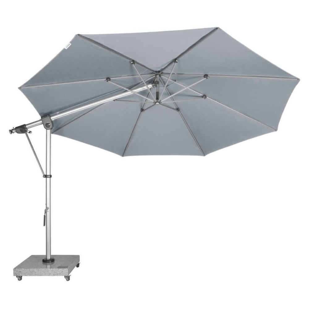 Doppler Expert Cantilever Parasol 350cm - Multifunctional umbrella, can be swivelled axially on both sides, can be rotated up to 360 degrees. This multifunctional parasol Expert 350 adapts optimally to the position of the sun thanks to its ability to rotate 360° degrees and adjust axially on both sides. With just one movement, the umbrella can be closed in a few seconds. Completely new and unique is the newly developed "timing belt drive". This ensures trouble-free operation when opening and closing the parasol. The 2-colour woven polyester cover is particularly durable and meets the highest demands. It has a high lightfastness and a strong UV protection of 80. The cover is removable and can also be washed by hand. All moving parts are screwed together and therefore easily replaceable. Parasol Design T840 anthracite Umbrella size approx. 350 cm; 8 pcs. Round umbrella Recommended base weight min. 140 kg Passage height: approx. 200 cm Height adjustable: no 360° rotatable with hand lever Includes protective cover and lashing strap Frame: Stick / tube diameter: 65 mm Aluminium frame Aluminum rails With crank mechanism and safety strap Reference: 100% polyester fabric; approx. 220 g/m² UV protection 80 Lightfastness 7 Rain-repellent Cover removable / hand wash