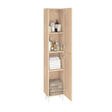 The EASY concept 2-door storage columns have been designed in such a way that their heights and widths offer an optimized storage capacity. They have 4 modular spaces thanks to 2 height-adjustable shelves, adjustable in 3 positions. This EASY 2-door storage column includes 4 legs. It can be mounted and fixed in a non-load-bearing wall. The legs of this EASY 2-door storage columns are adjustable in height, each independently. This guarantees the stability of the product, in addition to fixing the furniture to the wall. The range of EASY 2-door storage columns is ideal for your bathroom design. This EASY storage column is made in Italy thanks to a unique wood recycling process. The furniture of the EASY concept has all been designed using wood panels made from recycled wood and FSC-certified wood. The EASY 2-door storage column is self-assembling and can be fixed to the wall (Use screws, washers and dowels adapted to the type of material of your wall). These are not included)