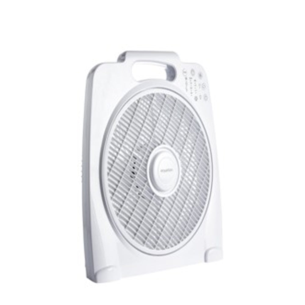 White plastic countertop fan with remote control. Product size: 39.5*18*43.2CM Power rating:40W Features: 3 speeds,3 modes, 7.5hours timer, Class II.
