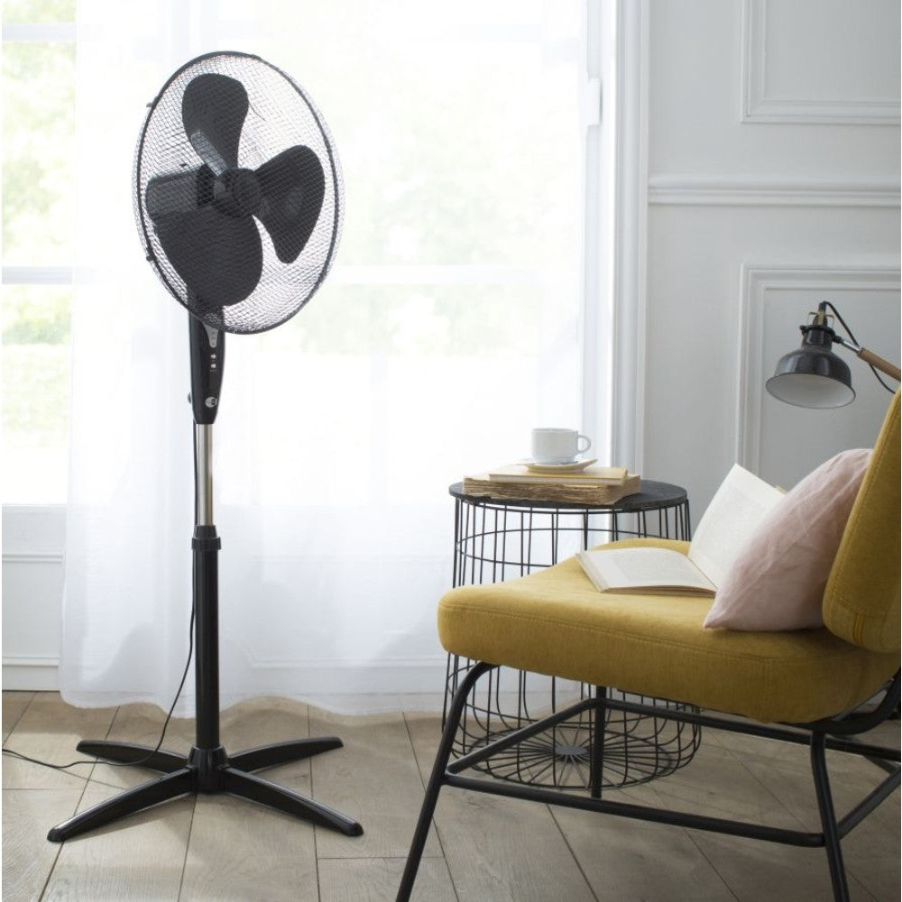 Fan a living room, bedroom or office. For more comfort, use the remote control (2 aaa batteries not included). Set the timer up to 7.5 hours before automatic shutdown. Features 3 fan speeds. Automatic air sweeping thanks to its 85 degree oscillating base, adjustable height and fan tilt. Designed with a shock-proof foot. Unit size: 66cm x 66cm x 125cm, Power rating: 45w, 3 speeds, oscillation, with remote control, 7.5 hours timer, class ll